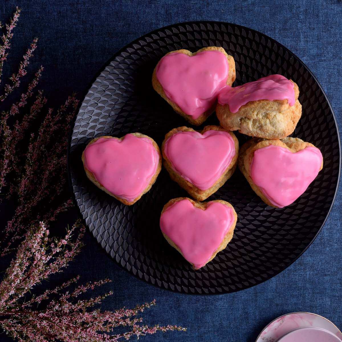 - Once the scones are cooled, add about 4 tbsp of the glaze to a piping bag fitted with an extra fine nozzle, (or a small syringe). Pipe a heart shape on the top of the scones, being careful to leave a little gap along the edge. Repeat for all scones and leave to set for at least 10 minutes.