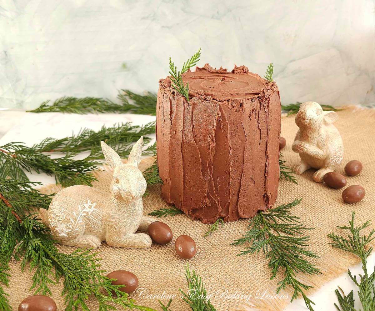 - Spread chocolate buttercream on the top of the cake and on the sides as a crumb coat, but no need to scrape off the buttercream, just apply a layer to cover. Spread on the sides in upward strokes to resemble tree bark. Then chill the cake for 30 – 60 minutes to set.