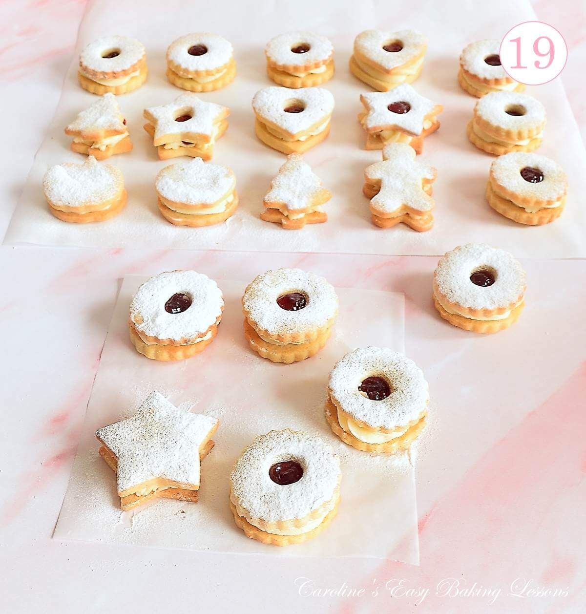 You can dust the ‘tops’ of the biscuits with a fine dusting of icing/powdered sugar but not typical for Jammie Dodgers. To do this for the cookies with a cut-out top, dust them with sugar when you have the ‘tops’ altogether and before assembling the seasonal Jammie Dodgers, as shown in Photo 15.